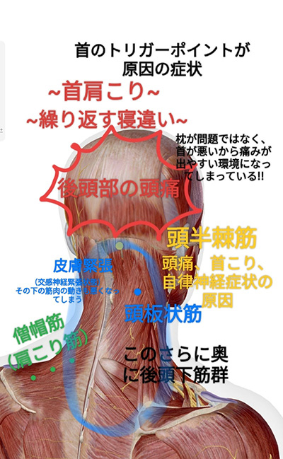 首肩に形成されたトリガーポイントが原因の症状(こり感、頻発するTP活性による寝違い、頭痛)だと判断。